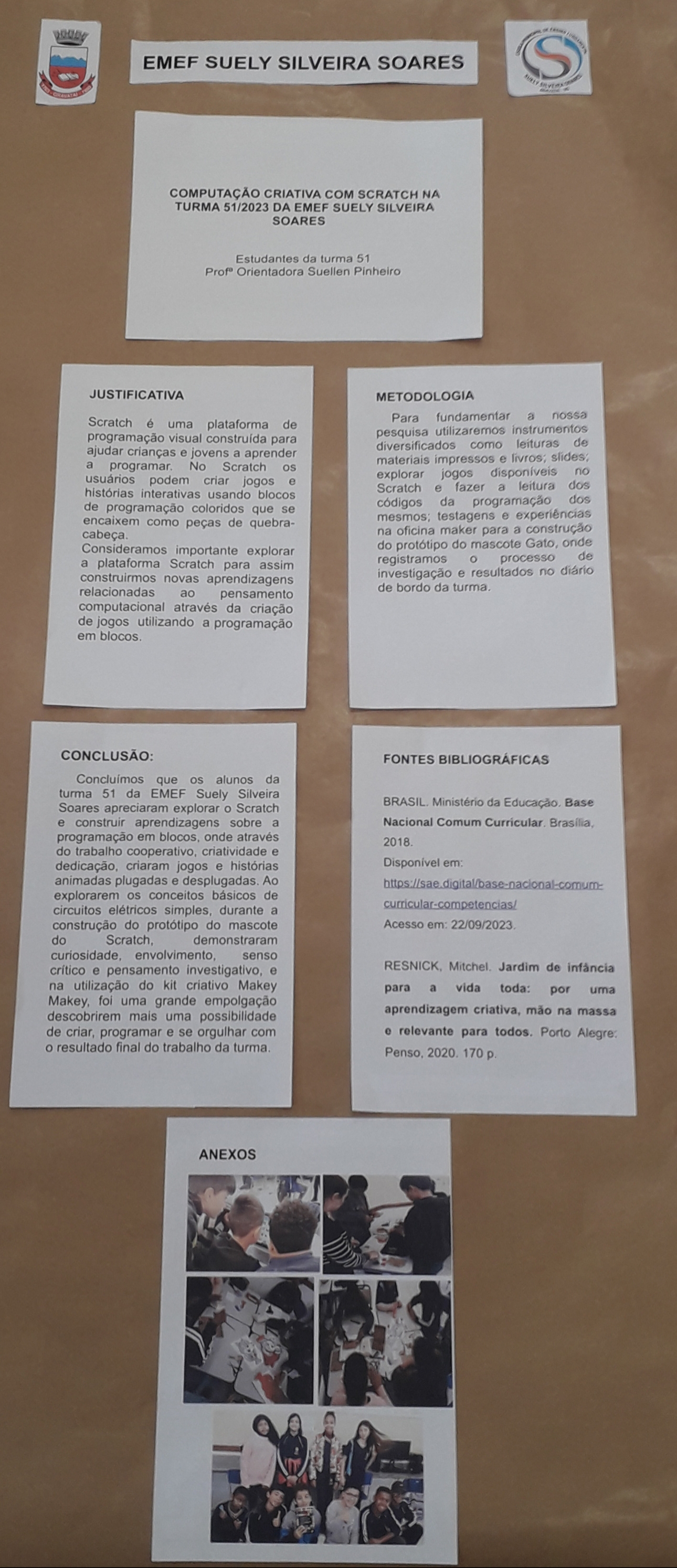 Scratch é uma plataforma de programação visual projetada para ajudar crianças e jovens a aprender a codificar. Foi criada pelo Mit Media Lab e lançado em 2007. O Scratch permite que os usuários criem animações, jogos e histórias interativas usando blocos de programação coloridos que se encaixem como peças de quebra- cabeça, mesmo tendo poucos conhecimentos computacionais. Os alunos da turma 51/2023 consideraram importante explorar a plataforma Scratch para assim construírem novas aprendizagens relacionadas ao pensamento computacional, através da criação de jogos e animações utilizando a programação em blocos. No laboratório de informática da nossa escola, trabalhando em pares, foi possível soltar a imaginação e testar blocos simples como por exemplo, programar para um personagem falar, andar, girar e até mesmo escolher um cenário para o fundo dos nossos jogos e histórias. Na sala de aula, exploramos e criamos histórias com o Scratch Desplugado, que é uma maneira de programar sem o uso do computador. Com testagens, experiências e observações, nas Oficinas Maker, construímos um protótipo do mascote do Scratch, o Gato, utilizando papelão e alguns componentes eletrônicos como mini motor DC, pilhas e baterias. Registramos o processo de investigação e resultados no diário de bordo da turma. Concluímos que os alunos da turma 51 da EMEF Suely Silveira Soares apreciaram explorar o Scratch e construir aprendizagens sobre a programação em blocos, onde através do trabalho cooperativo, criatividade e dedicação, criaram jogos e histórias animadas. Ao explorarem os conceitos básicos de circuitos elétricos simples, durante a construção do protótipo do mascote do Scratch, demonstraram curiosidade, envolvimento, senso crítico e pensamento investigativo, e na utilização do kit criativo Makey Makey, foi uma grande empolgação descobrirem mais uma possibilidade de criar, programar e se orgulhar com o resultado final do trabalho da turma.